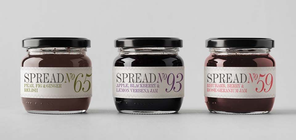 Labels were designed for the collection of pickles, preserves and jams with a strong use of colour.